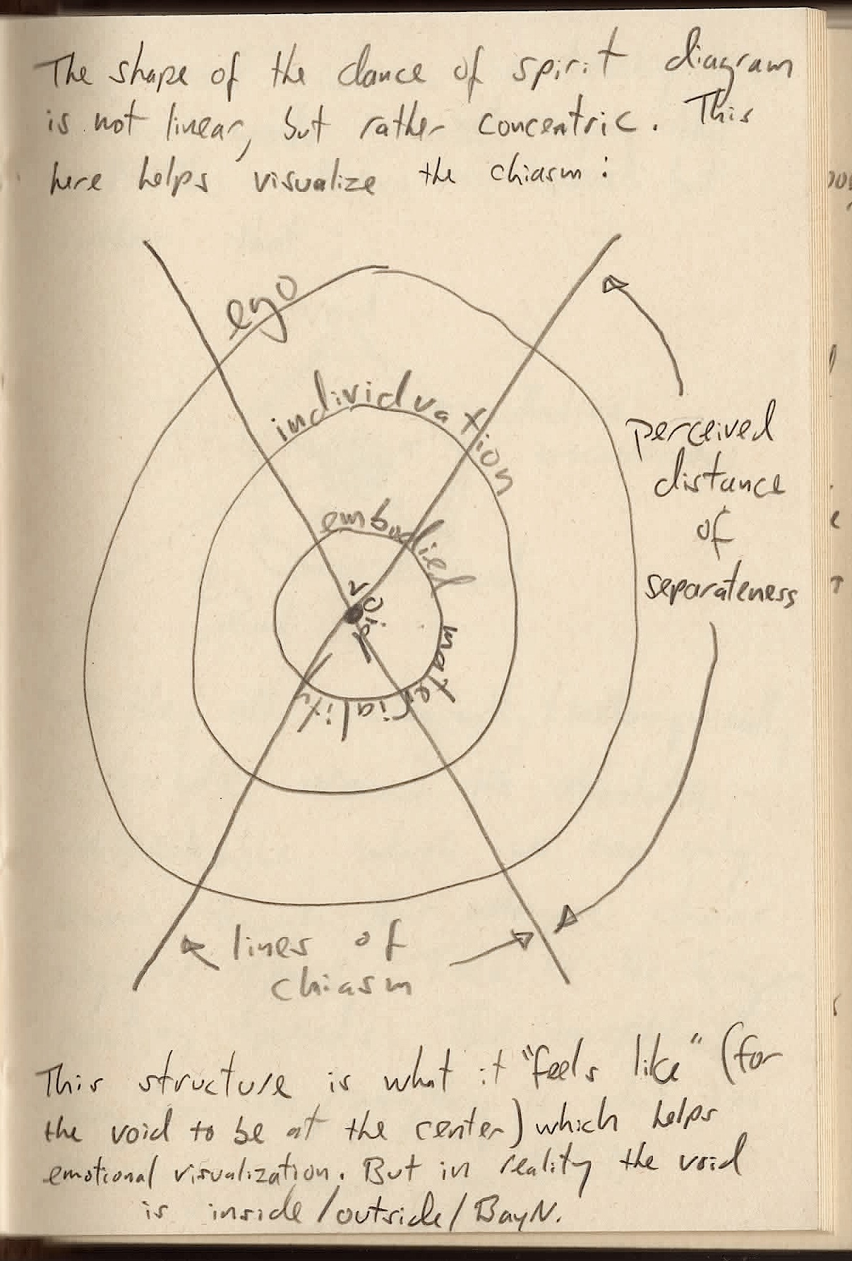The Dance of Spirit schematic is “unfolded” so it can be more legible. Its content, however, is concentric rather than linear. This diagram helps me visualize each concept’s spatial relationship with one another. This is how the Dance of Spirit feels – with the ego category on the outside ring, and the void category at the very center. This structure depicts how two points on the ego-level can feel so separate, while all points at the void-level are identical.