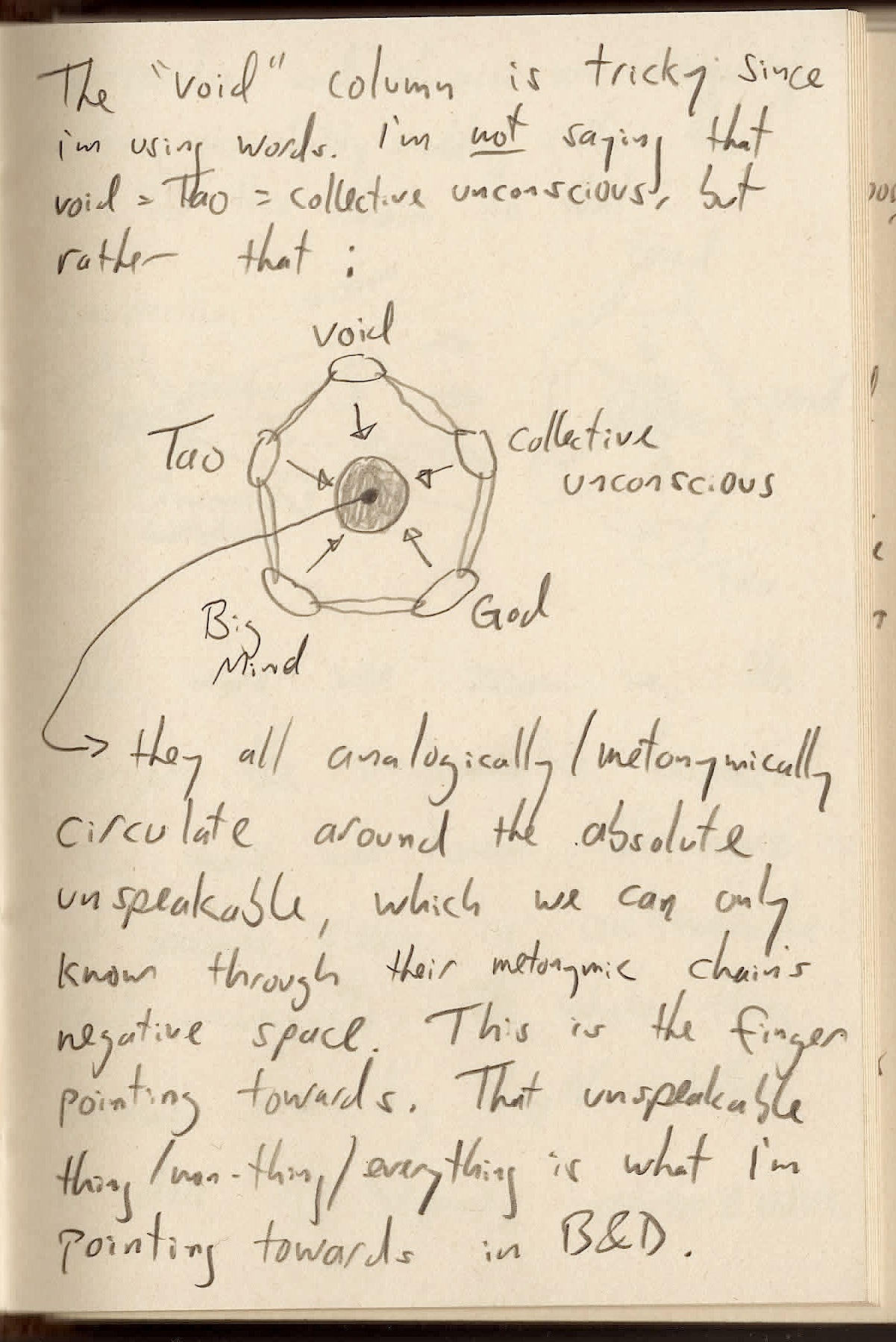 This page clarifies what’s being said in each category, specifically the void-level category. I’m not saying that each concept is identical. Rather, each idea in the void-level category is analogically linked to the others through metapattern. All of these terms, in concert, gesture toward the unspeakable.